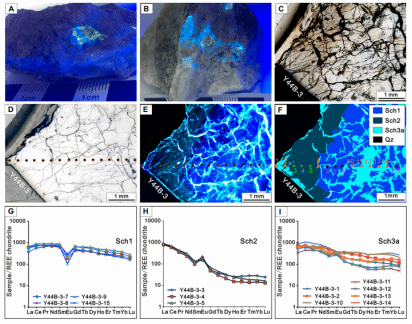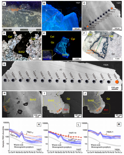 (1)Sch1以浸染状赋存于二长花岗斑岩和花岗斑岩中,颗粒形态多为次圆至他形,在紫外光照射下呈现均匀的蓝色荧光。Sch1主要与斜长石、钾长石、磷灰石、金红石等矿物共生(图2)。Sch1富含稀土元素,其∑REE+Y值介于1471 ppm至4059 ppm之间,表现出轻稀土元素(LREE)富集的特性,并伴有显著的Eu负异常(图2H-I)。Sch1的沉淀过程与早期岩浆热液有关,继承了阳储岭岩浆岩中LREE富集、HREE亏损以及Eu负异常的特征。