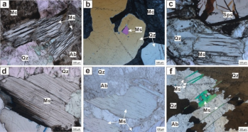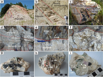 tyc122ccVIP赵新福教授团队选取幕阜山北缘断峰山地区的伟晶岩及相关花岗岩体作为研究对象,对不同期次的花岗岩(图1)、赋存于花岗岩基内的贫矿伟晶岩(图2a-c)及赋存在片岩中的稀有金属伟晶岩(图2d-f)开展了详细的白云母矿物学和地球化学对比研究。
