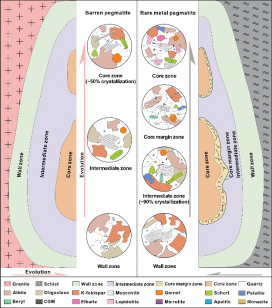 图5.断峰山地区伟晶岩分异结晶和稀有金属富集过程示意图。贫矿伟晶岩经历了较低程度的分异结晶,无稀有金属矿物产出。相比之下,稀有金属伟晶岩在经历了约90%的分异结晶时,铌钽铁矿、绿柱石和透锂长石等稀有金属矿物开始在中间带结晶。