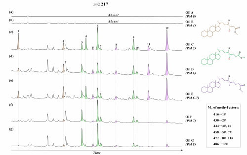 tyc122ccVIP朱钢添副教授团队选取南襄盆地泌阳凹陷原油作为研究对象,通过气相色谱-质谱(GC-MS)、全二维气相色谱-飞行时间质谱(GC×GC/ToF-MS),系统分析了一系列母源关系接近但生物降解等级不同的原油样品中的甾烷酸分布。GC-MS分析结果表明,在未降解和低降解等级的原油样品中,未检出甾烷酸信号,只有在生物等级较高(规则甾烷开始发生明显降解)的原油样品中才能检测到甾烷酸,说明该类酸性生物标志物是甾烷的生物降解产物(图1)。