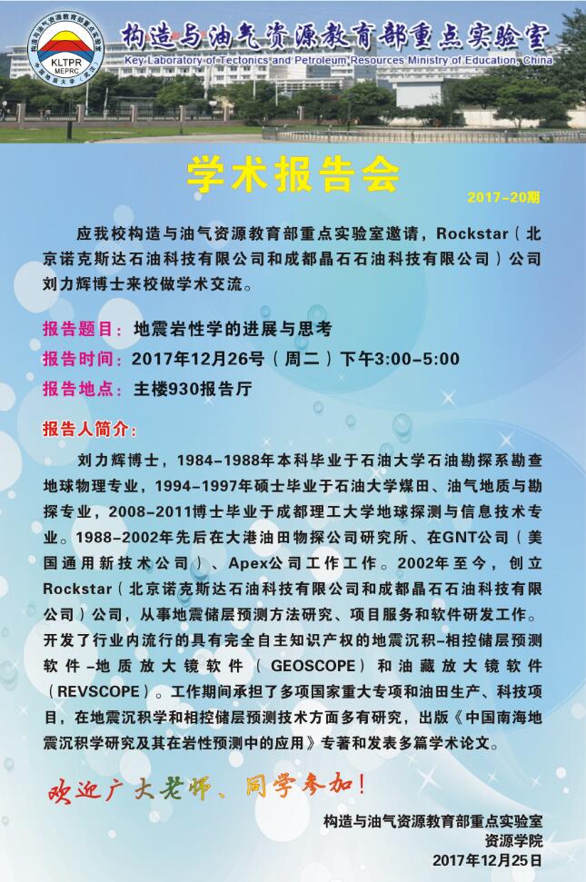 [12月26日]构造与油气资源教育部重点实验室2017-20期:刘力辉学术报告