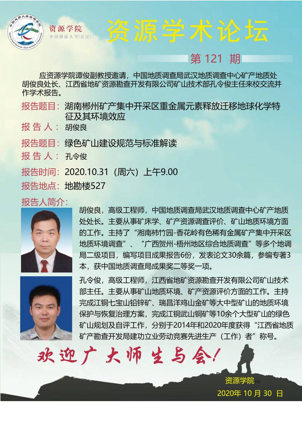 【10月31日】第121期资源学术论坛:胡俊良、孔令俊学术报告