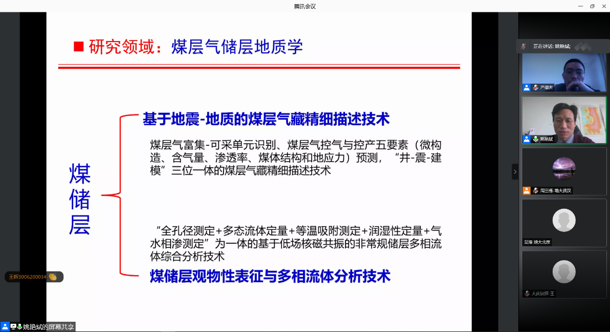 2020年12月15日,应公司严德天教授和周三栋教授邀请,tyc122ccVIP(北京)姚艳斌教授同师生线上交流并作题为“煤储层物性与流体特征分析新技术:核磁共振”的学术报告。