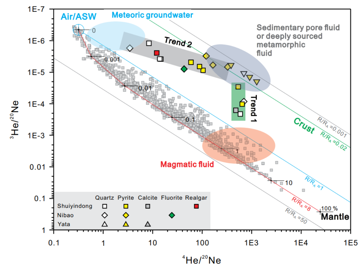 本次研究我们选取了右江盆地主要赋存于沉凝灰岩中的泥堡金矿、主要赋存于生屑灰岩中的水银洞金矿和主要赋存于钙质碎屑岩中的丫他金矿床三个典型矿床为研究对象,对不同成矿阶段矿石和脉石矿物(黄铁矿、石英、方解石、萤石和雄黄)中的流体包裹体稀有气体同位素组成进行分析研究。尽管这些矿物在形成后可能受到成矿后其他地质过程不同程度的改造,但稀有气体同位素能很好的保存成矿流体的源区属性特征。通过详细的野外地质观察和矿相学研究,查明典型矿床主成矿期和成矿晚期两阶段的矿石和脉石矿物组成,进而对这些不同热液矿物流体包裹体中稀有气体同位素组成进行分析,结果显示样品中4He的含量为0.001−1.428 µcc/g,相应的R/Ra比值为0.012−1.436。详细的讨论分析后发现(1)所获得不同热液矿物流体包裹体稀有气体同位素组成中几乎不含有宇宙成因或核衰变成因的3He和放射性成因4He,尽管不同热液矿物流体包裹体中稀有气体同位素总量可能在成矿后发生了一定程度丢失,但同位素比值仍保持稳定且可用于成矿流体的源区示踪;(2)不同热液矿物流体包裹体中稀有气体同位素组成显示明显的幔源、壳源放射性成因和饱和大气降水中大气来源的三端元混合组成,具体有幔源3He和4He、壳源放射成因4He、和循环大气降水中的Ar和Ne;(3)不同热液矿物流体包裹体稀有气体同位素组成在3He/20Ne vs. 4He/20Ne相关性图解中显示出明显不同的两条混合趋势线(图3)。结合三个典型矿床中不同热液矿物的生成顺序,认为趋势线1反映了主成矿阶段热液矿物流体包裹体稀有气体同位素组成变化,记录了岩浆流体和地壳浅部沉积岩中孔隙流体或深源变质流体的混合特征;而趋势线2反映了成矿晚阶段热液矿物流体包裹体稀有气体同位素组成变化,记录了地壳浅部沉积岩中孔隙流体或深源变质流体与循环大气降水的混合特征。在已有研究的基础上,我们认为这次新获取的稀有气体同位素组成数据特征显示右江盆地卡林型金矿床的初始成矿流体为岩浆来源,成矿过程中先后与地壳浅部沉积岩中的孔隙流体或深源变质流体及循环大气降水发生了明显的混合作用。基于此,我们提出了右江盆地卡林型金矿床的成矿作用具有“三端元两阶段成矿”的成因模式认识。