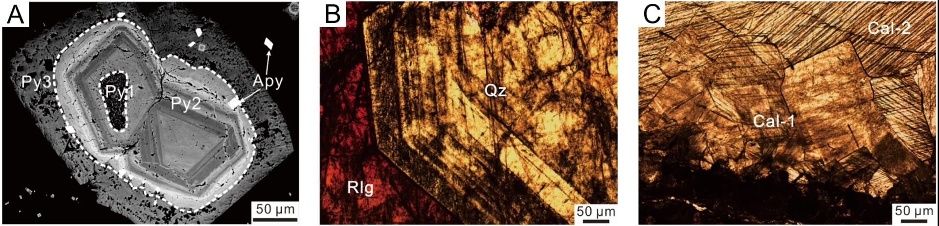 图2. A.具环带结构载金砷黄铁矿;B. 与雄黄共生具环带状增结构石英;C. 沿裂隙充填多期增生方解石