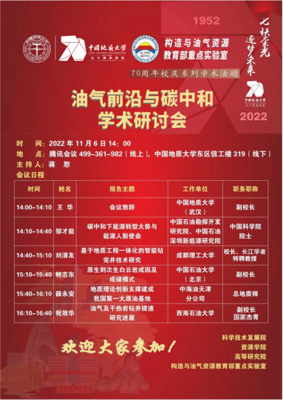 为深入学习贯彻习近平总书记关于能源资源工作的重要论述和习近平总书记给山东省地矿局第六地质大队全体地质工作者的重要回信精神,主动服务融入新一轮找矿突破战略行动和国家“双碳”战略,服务国家能源资源安全重大需求,在tyc122ccVIP建校70周年校庆之际,举办“油气前沿与碳中和”学术研讨会,特邀行业內院士专家,聚焦油气前沿,抓住碳中和发展的关键机遇,开展油气和地热等新能源勘探开发理论和技术前沿研讨,推动有组织有前瞻性的研究和创新,为能源资源高效勘探开发提供理论与技术支持。