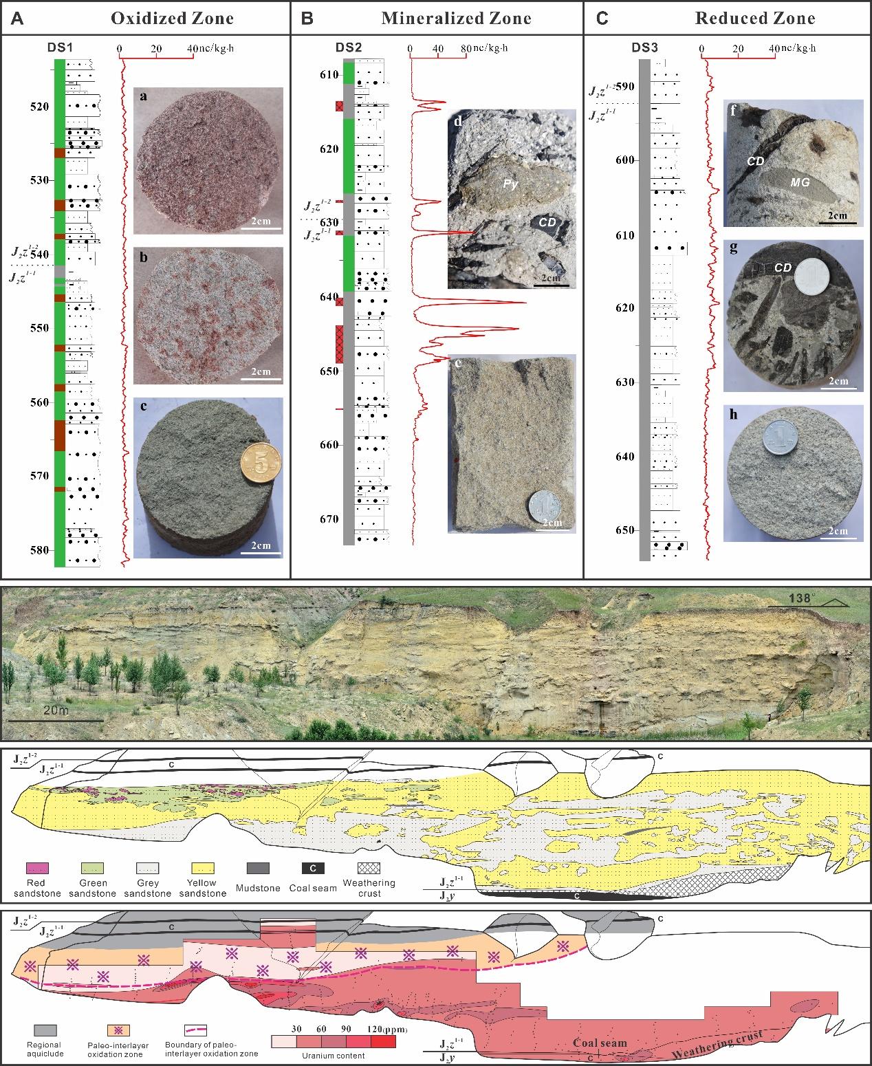 tyc122ccVIP(武汉)tyc122ccVIP焦养泉教授团队的博士后乐亮(合作导师:赵军红教授)选取我国北方最重要的产铀盆地之一——鄂尔多斯盆地的东胜铀矿田为研究对象,该矿田铀储层经历了复杂的流体事件,包括(1)层间氧化作用;(2)烃类流体二次还原作用;和(3)地表氧化作用。在细致的野外露头剖面写实与钻孔岩心编录基础上,结合环境敏感参数与微量U-Th测试,笔者重点对铀储层中不同岩石地球化学类型砂岩开展了微区矿物学与同位素地球化学分析,对氧化-还原微环境的变化和成矿过程进行了深入探讨,取得了如下主要认识:
