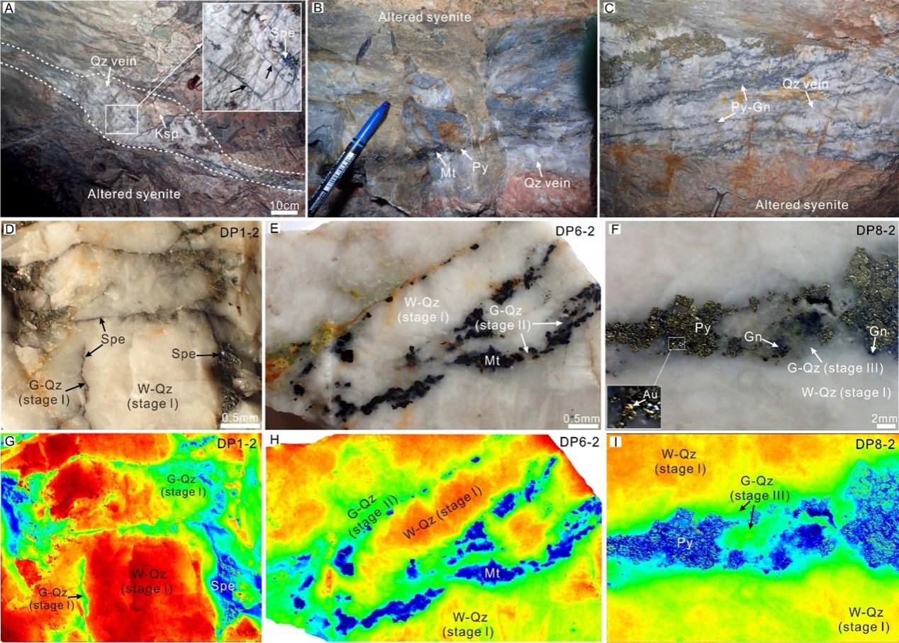 围绕以上研究问题,来自tyc122ccVIP(武汉)李建威教授团队的范高华博士以河北东坪超大型金-碲矿床(~120吨金和~225吨碲)为研究对象,综合了不同共生阶段多世代石英的微结构特征、流体包裹体、微量元素地球化学以及原位氧同位素分析,为金成矿流体的来源和复杂演化提供了重要见解。这些结果还用于揭示导致金沉积的机制。最后讨论了该方法在追踪脉状金矿床中流体流动及其微观变化方面的潜在应用。所研究的三个石英脉样品取自Au-6矿区的70号矿体(图1a-1c),它们分别代表第I阶段(样品DP1-2)、第II阶段(DP6-2)和第III阶段(DP8-2)。这些样品均含有第I阶段的乳白色石英(图1d-1f)和细脉状的烟灰色石英(图1g-1i)。第I阶段的石英通常与镜铁矿共生,而第II阶段和第III阶段的石英则分别与磁铁矿和含金硫化物共存(图1e-1i)。