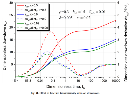 研究表明,地下流体流动可以分为井筒储集、早期径向流、拟球形流、基质-裂缝窜流和径向流动五个流动段;在双对数图上,不同流动阶段显示一些特殊数值或形态;在半对数图上,导数曲线将有一个明显的波峰/波谷出现,这将是双渗流动的本质特征;最后分析了基质-裂缝窜流系数、各向异性、井筒储集系数、表皮因子、穿透比等参数井筒降深的影响。模型的提出对于准确认识部分射开井在双渗储层中的渗流具有重要意义,也为天然裂缝储层试井分析及产能评价工作奠定了理论基础,丰富了模型库。