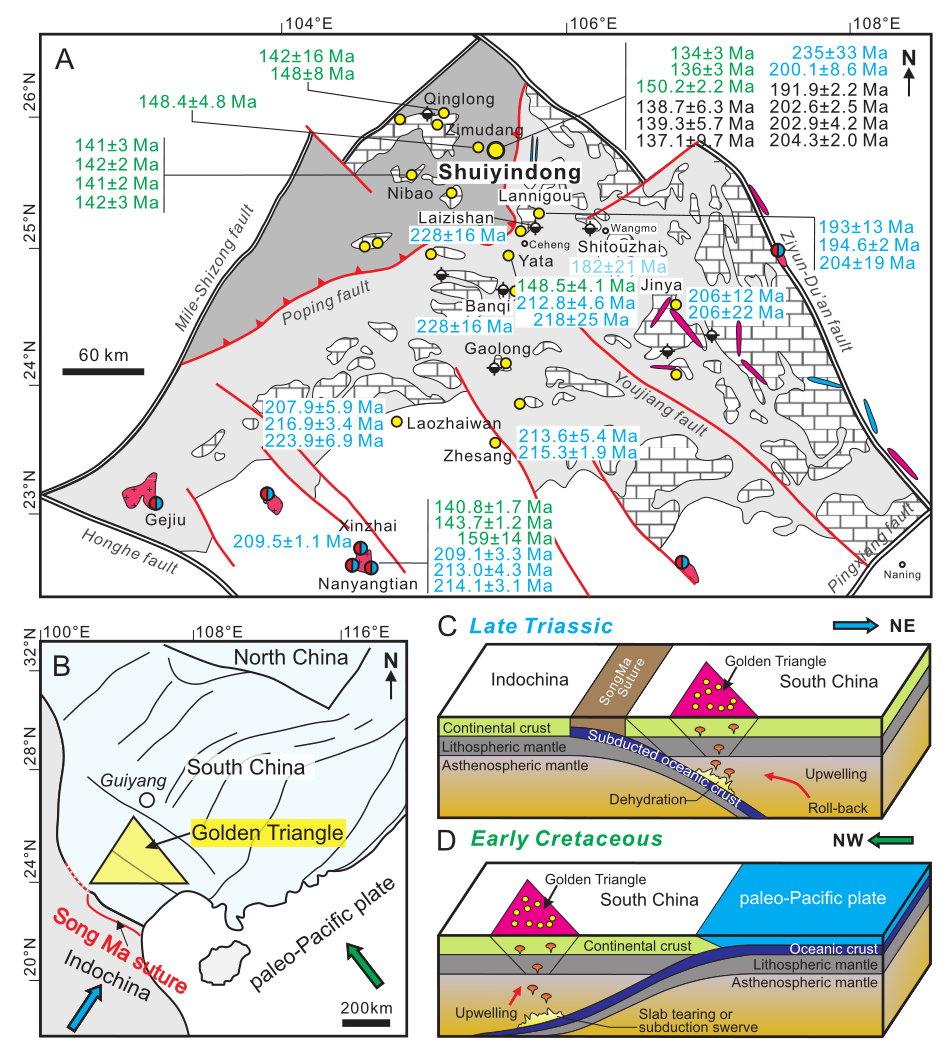 上述新的同位素年龄结果显示右江盆地水银洞金矿床形成于晚三叠世并在早侏罗世和早白垩世经历了两次热液活动叠加。根据已有认识,如果与雄黄和/或雌黄共生的Cal_3形成于成矿晚阶段并且区域上已发表的其他金矿床的早白垩世同位素年龄(图5A)可靠的话,本次研究获得的Cal_3的形成年龄可能反映了右江盆地确实存在早白垩世卡林型金成矿事件。结合已有的同位素年代学数据(图5A)及区域构造演化(图5B),分析后我们认为右江盆地的卡林型金矿床可能形成于晚三叠世印支造山作用(图5C)和早白垩世古太平洋板块俯冲作用(图5D)相关的伸展构造背景。本次研究的结果表明,LA-(MC)-ICP-MS方解石U-Pb测年法可用于约束卡林型金矿床的成矿时代及叠加热液事件。鉴于这类矿床的赋矿岩石主要为不纯的碳酸盐岩,普遍发育脱碳酸盐化并发育大量热液方解石,我们相信该测年方法有望成为具普适性的可推广的卡林型金矿床成矿年代学研究手段。