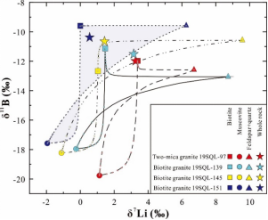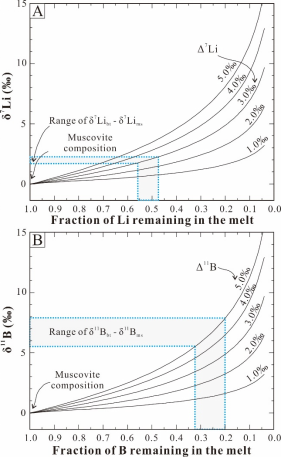 本次研究揭示了:(1)晚期熔体和岩浆流体不能反应其早期熔体的成分;(2)在岩浆演化持续时间长的过程中结晶的矿物,单个颗粒内部可能会出现从核部到边部的Li和B同位素分带现象;(3)晚期岩浆流体引起的矿物选择性蚀变会掩盖流体的来源,这种情况下流体的Li和B同位素反应了蚀变矿物的同位素成分,而不是岩石的同位素成分。