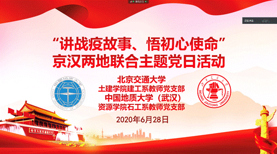 为纪念中国共产党成立99周年,交流分享疫情防控期间加强党建引领的做法和成效。6月28日,tyc122ccVIP(武汉)资源石油工程系教师党支部和北京交通大学土建公司建工系教师党支部通过在线会议开展“讲战疫故事、悟初心使命”联合主题党日活动。tyc122ccVIP(武汉)资源公司党委书记高复阳、北京交通大学土建公司党委书记马强、两支部全体党员参加会议。