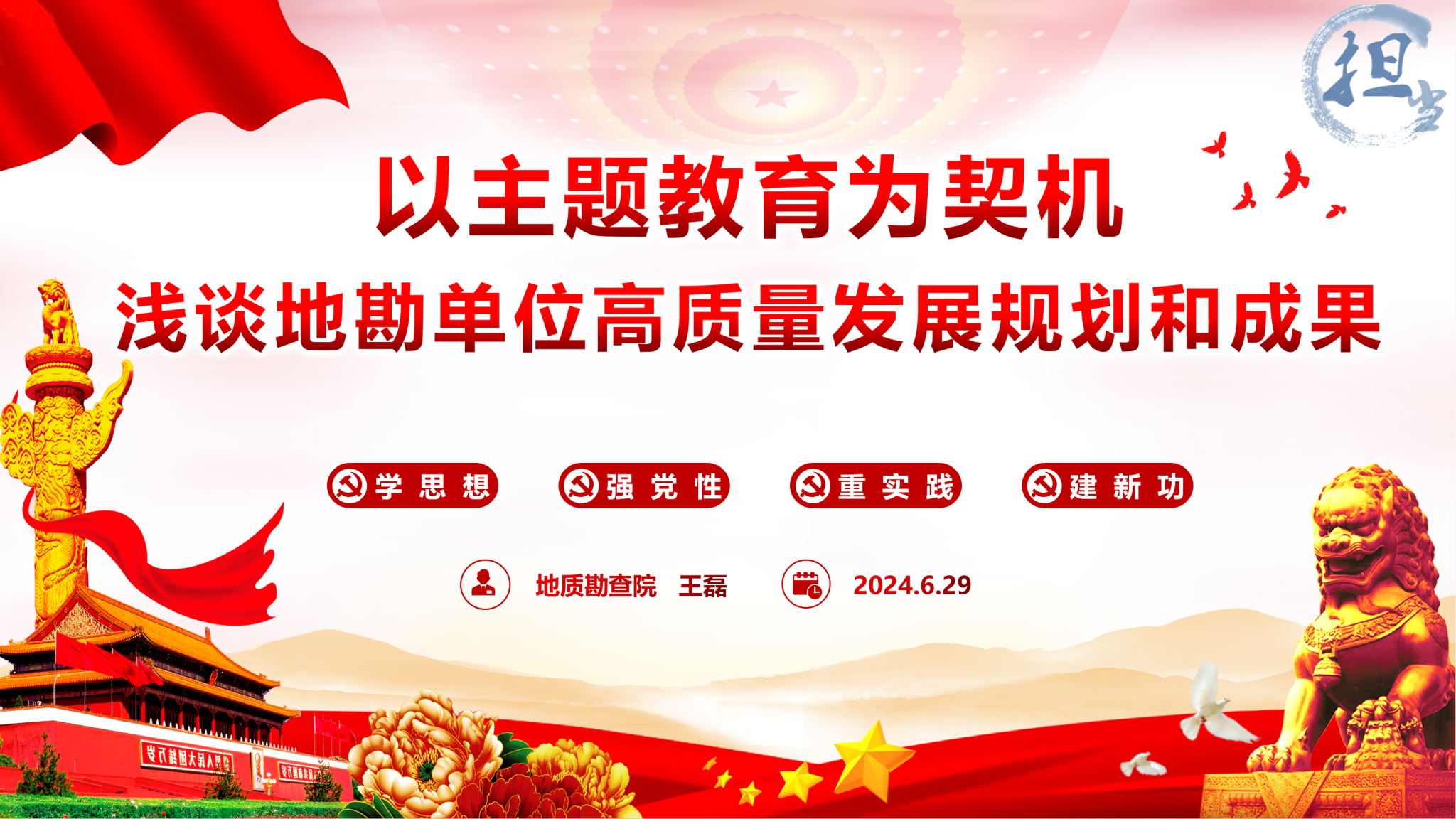 随后,第一地质大队地质勘查院王磊副经理以“以主题教育为契机,浅谈地勘单位高质量发展规划和成果”为主题,从把握发展阶段、贯彻新发展理念、构建新发展格局和单位近期成果等4个方面,介绍了单位在党建引领、工作谋划和高质量发展方面所取得的成效,并就系和地勘院前期联合开展的理论研究与找矿成果进行了详细介绍。