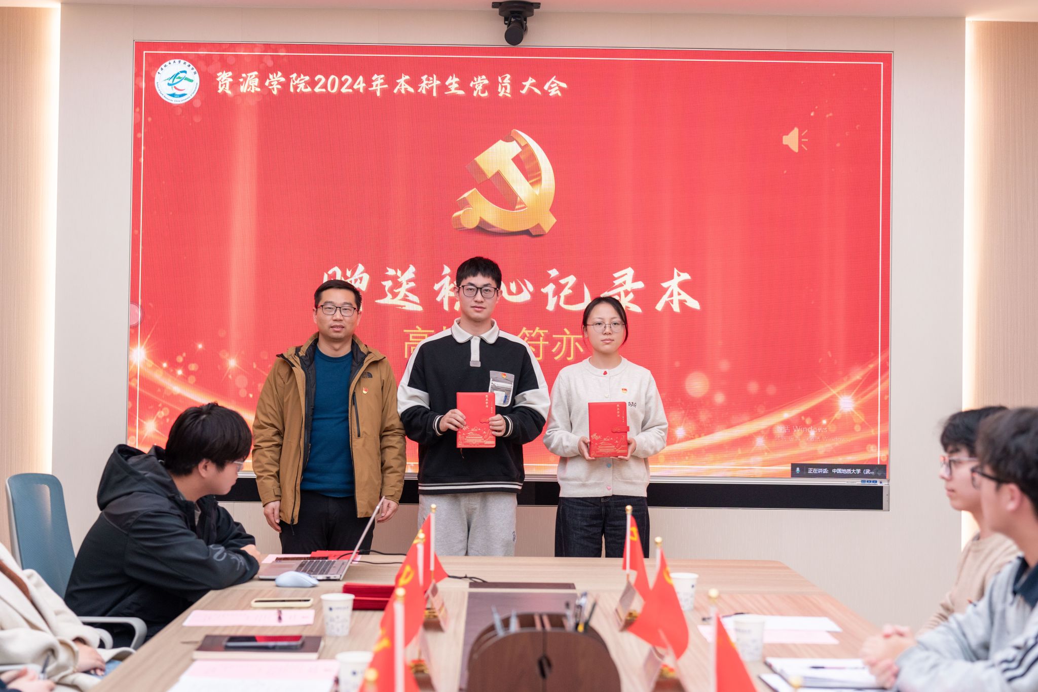 汪再奇,谭文伦,彭鑫分别为2022级本科生新发展党员颁发政治生日卡。