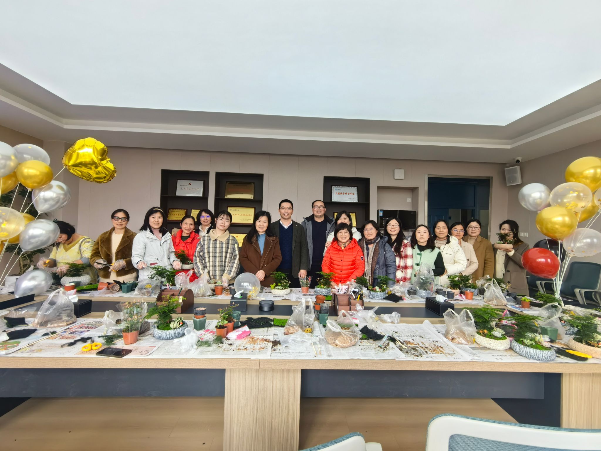 在欢快温馨的节日氛围中,园艺师为公司女教职工们讲解微景观艺术的基础知识,包括微景观的造型设计、制作技巧,多肉植物等的种植、护理常识,让大家感受到了微景观的艺术美,并同步示范展示了微景观的制作过程。老师们亲切交流,一盆盆精致的微景观陆续呈现,在欢声笑语中,大家脸上都洋溢着美丽的笑容,于方寸之间共赴春日之约,在绿意盎然中陶冶高雅情操,用巧手慧心诠释魅力风采。