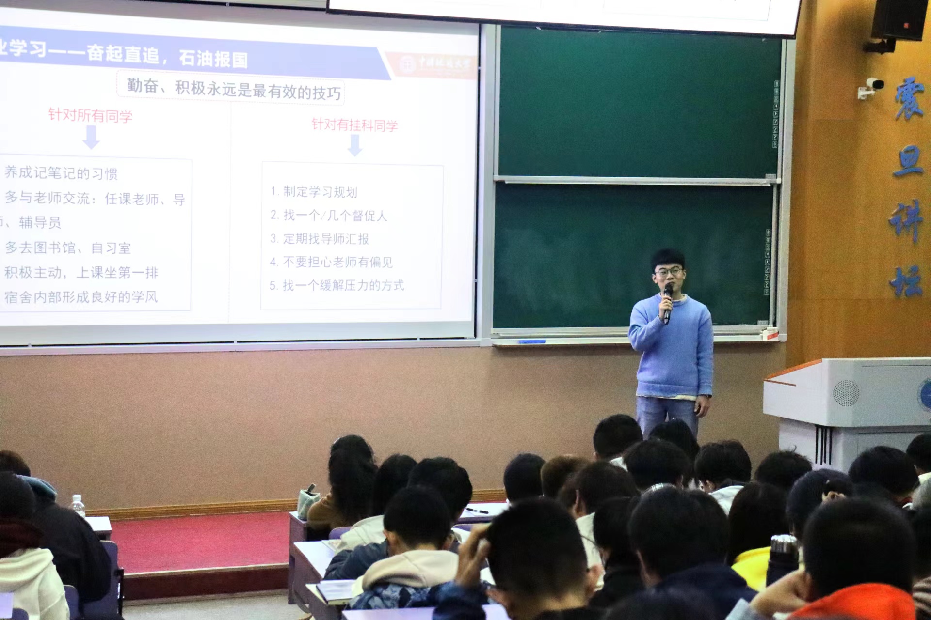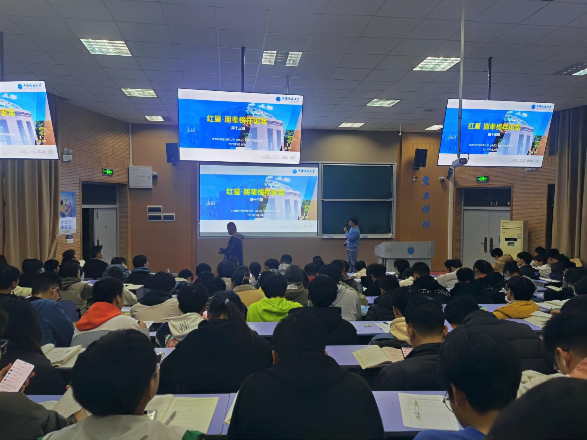03月26日下午,tyc122ccVIP第十三期红星·朋辈榜样论坛在教三楼110举行。辅导员刘明辉,石油工程系2022级研究生聂思嘉,2022级全体本科生参加。刘明辉主持。
