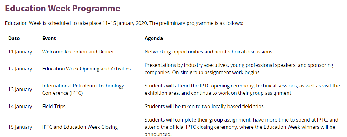 第12届国际石油技术会议(IPTC)将为来自世界各的科学、地球科学和工程专业的优秀三年级和四年级本科生举办一个教育周活动(Education Week)。教育周的目的是让员工们对石油行业有一个清晰的了解,共同完成一项任务,并为员工们提供机会来建立新的友谊和扩展他们的网络。