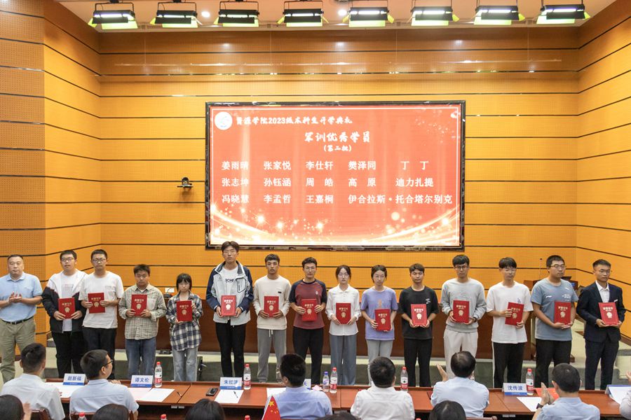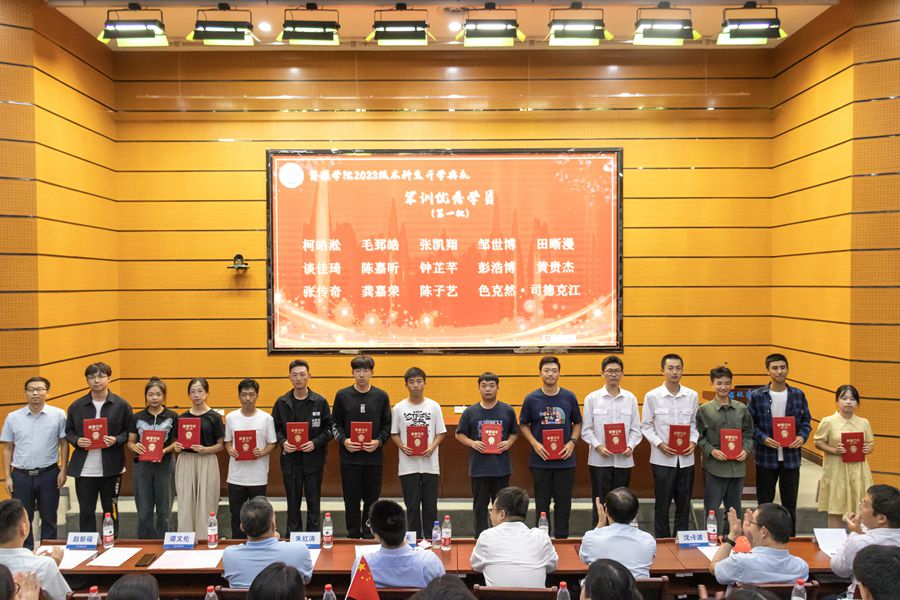 党委副书记谭文伦宣读军训表彰决定,对同学们发扬“求实进取,勇攀高峰”的院风学风,刻苦训练,敢于拼搏,争创一流表示肯定,希望同学们在今后的学习生活中团结互助,开拓创新,取得更大进步。宣读完毕,谭文伦副书记与朱红涛副经理共同为受表彰员工颁发荣誉证书。