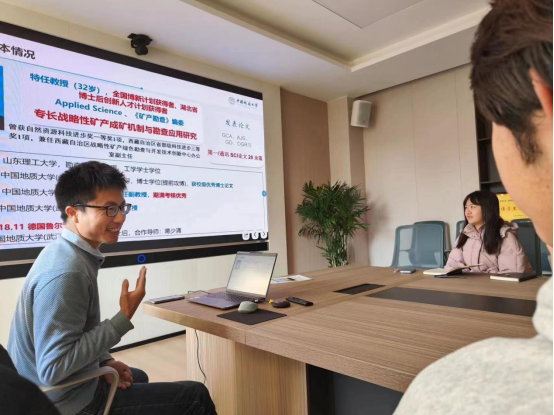 接着,陈教教授与员工们进行互动研讨。他以资源勘查工程2020级基地班的优秀员工代表吕骏腾为例,介绍他在学习、生活以及员工工作中的优秀事迹,为同学们树立榜样典型,鼓励同学们身体力行,践行地大“艰苦朴素、求真务实”的校训,争做做一名优秀的地大人。