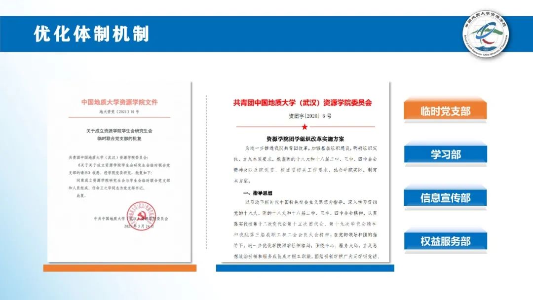 优化体制机制。我们成立临时党支部,持续增强员工会组织政治属性;结合全国学联要求,进一步优化组织架构,激发组织活力;规范召开学代会,凝聚青年智慧。