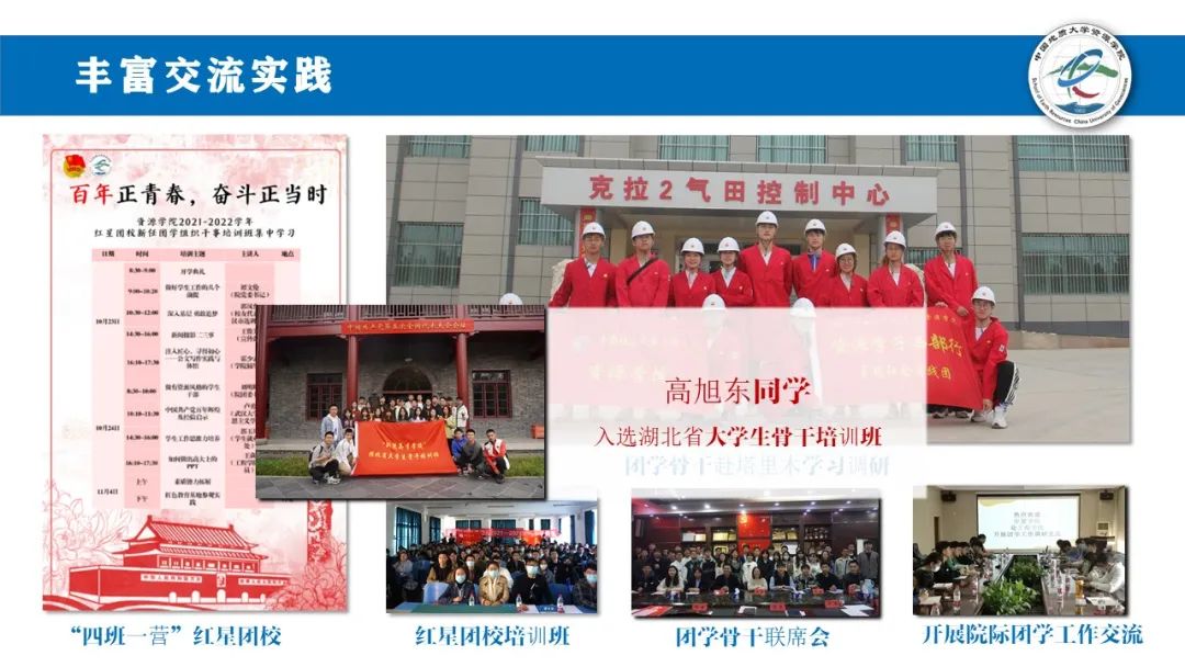 丰富交流实践。四班一营红星团校做到系统培训全覆盖;开展年度骨干联席会,交流共进;与兄弟公司开展工作交流,互学互鉴;团学骨干走进矿山油田,砥砺报国之志。主席团成员高旭东更是入选省大骨班。