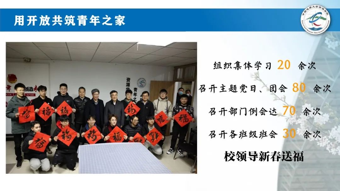 做好青年之家预约共享,累计召开主题党日、主题班团会、部门例会200余次,用开放共筑青年之家。青年之家成为了资源学子的打卡地,董事长也走进青年之家,送上新春祝福,分享成长故事,勉励资源学子专业报国。