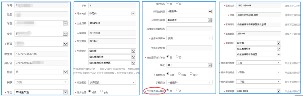 毕业生核对完善毕业生生源信息,包括生源所在地、政治面貌、城乡生源、困难生类别、主修外语语种、主修外语级别、学位、婚姻状况、户口是否转入公司、联系方式、电邮、家庭地址、家庭邮编、意向地区、意向单位性质、意向单位行业、意向职位类别、意向月薪等。
