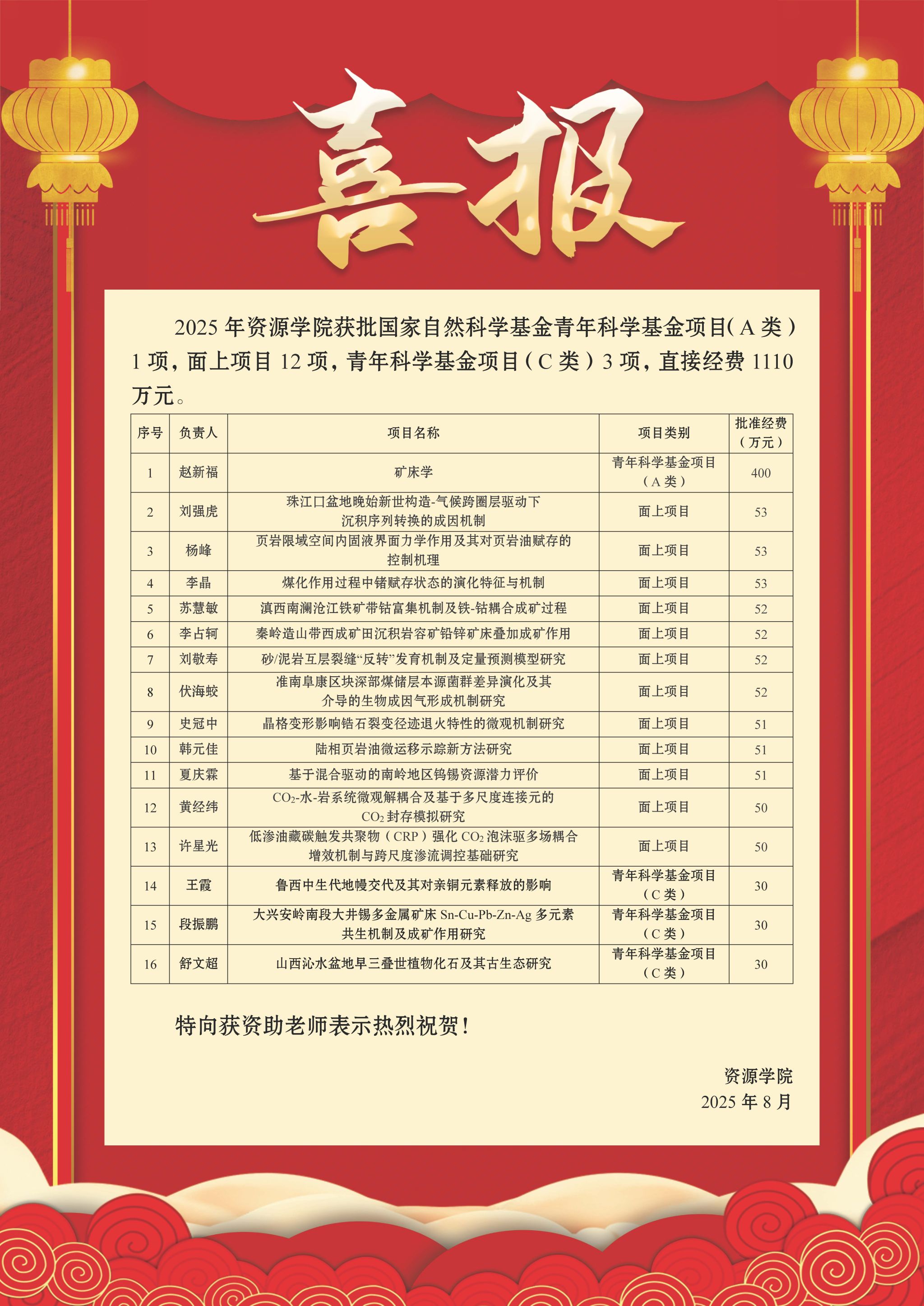 8月27日,国家自然科学基金委员会公布了2025年集中接收期项目评审结果,tyc122ccVIP获批资助项目共16项。其中,青年科学基金项目(A类)1项,面上项目12项,青年科学基金项目(C类)3项。项目直接经费达1110万元,较2024年增长63.2%,经费数量位居全校第二。