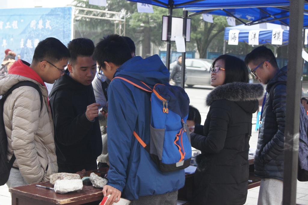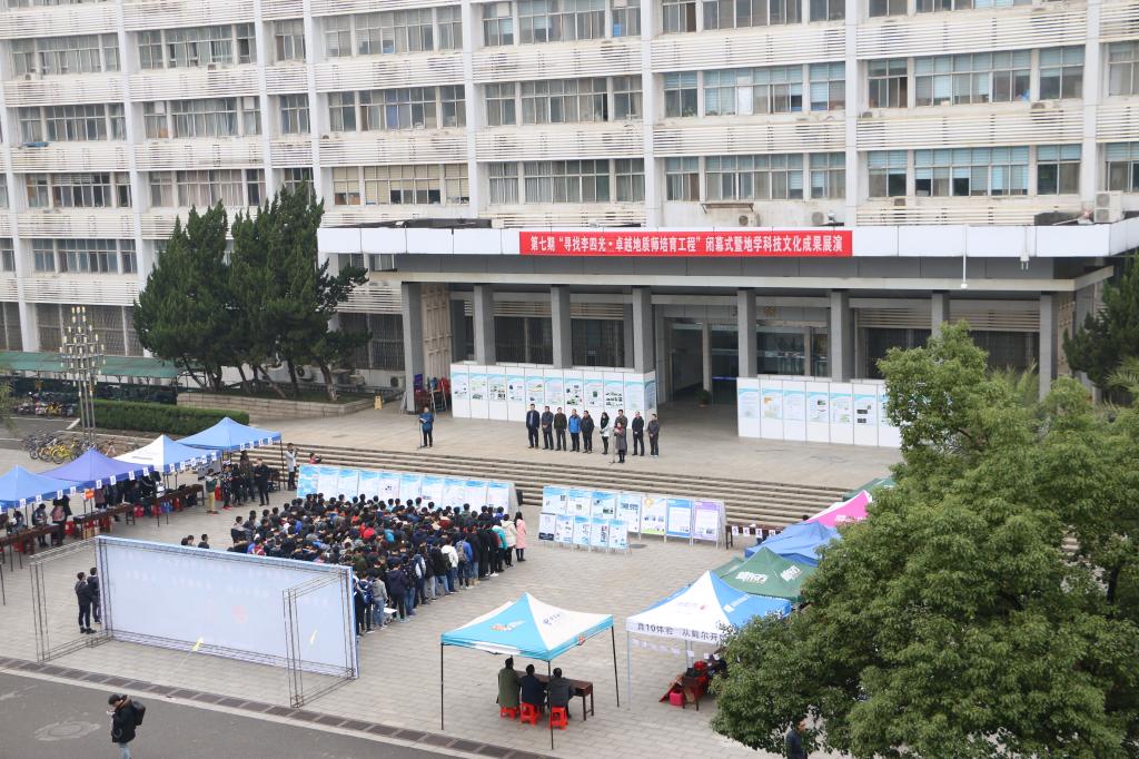 随后,领导嘉宾及同学们参观了地学科技文化成果展演。矿石展区的方铅矿、磁黄铁矿、辰砂等矿石引得同学们争相辨认;优秀野簿展区的野簿吸引了许多同学观看与学习;珠宝展区也聚集了不少同学观赏和辨认;化石展区的轮叶、江汉鱼化石也广受欢迎;影视展区的影片使同学们感受到地球诞生的奥妙。此外,原油展区、海洋模型展、无人机展区也人气极高,海报签名墙也吸引了广大师生签名与合影留念。