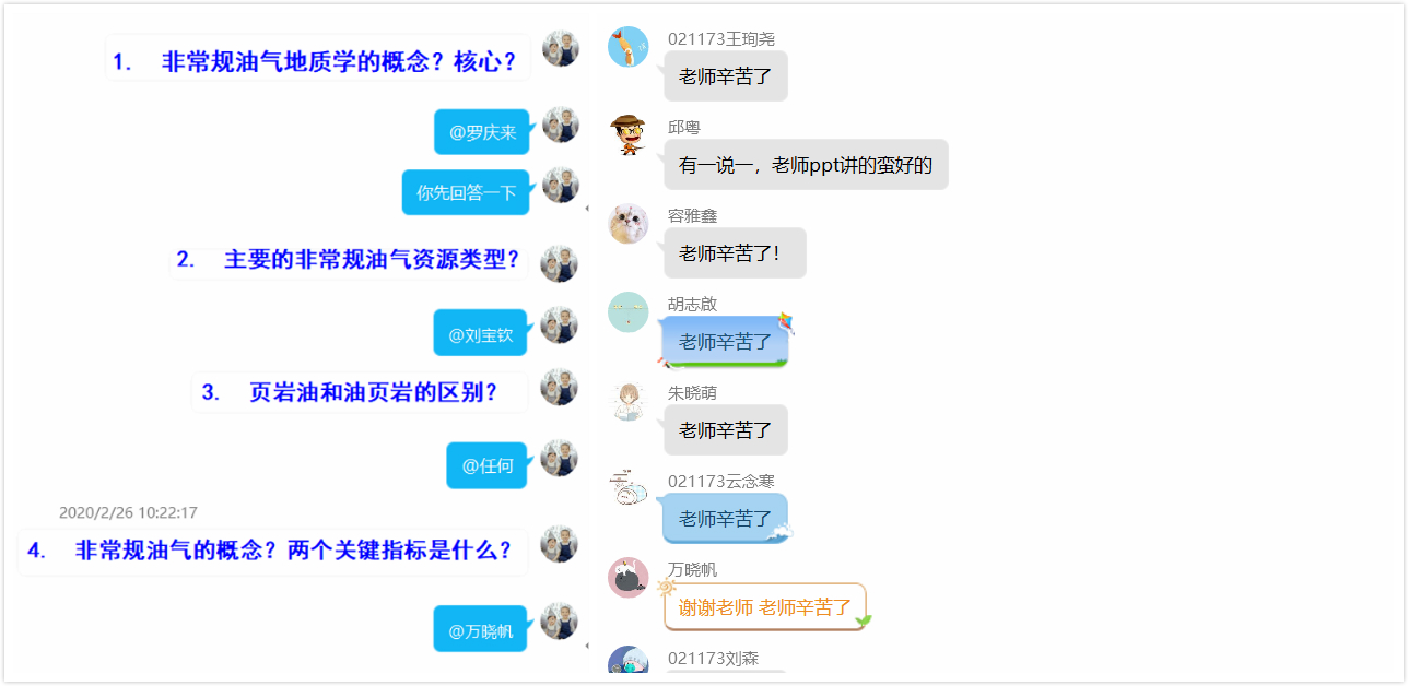 以上4门课程经过3周的网络教学,除了偶尔会受网络的流畅度影响外,员工反映效果良好。除以上4门课程外,资源勘查工程(新能源英才班)本学期还有《地热资源勘查与评价》、《测井地质学》、《地震地质综合解释》3门专业主干课程,目前也都针对疫情发展做好了回归课堂和网络授课的两手准备。