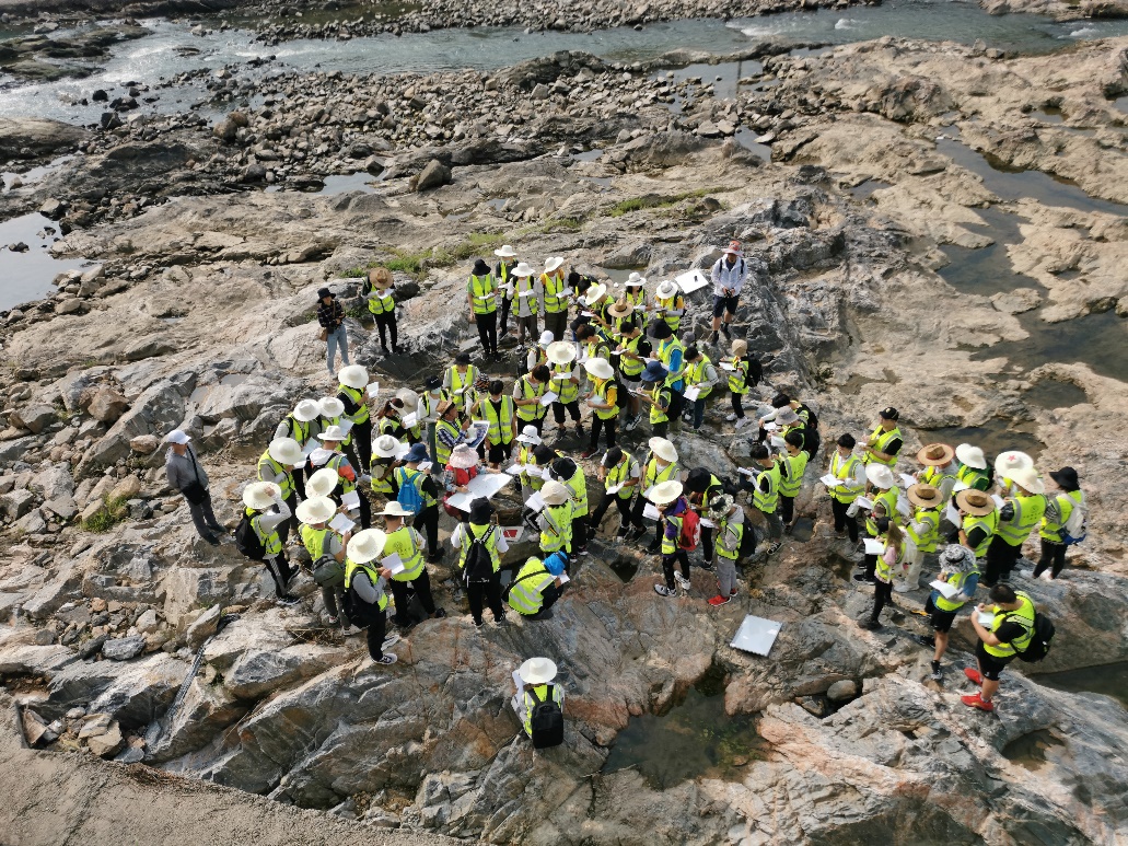 “在这炎炎的夏日,我头带草帽、身穿野外服、肩背地质包、包里放着罗盘、锤子、放大镜等地质人俗称的三大件,在媒人(实习指导老师)的带领下,与地质开始了一场令人终身难忘的初恋。”实习队蒋少涌老师在“武汉周边基础地质现象认知”讲座上动情说道。武汉黄陂、黄冈、黄石、咸宁都留下了资源人奋进的足迹和探寻的身影,在天堂寨水库湿地,同学们领略湖泊地质作用的沧海桑田;在黄石矿山公园,同学们感受到中国第一支大型地质勘探队(429队)的地质精神;在一个个风景名胜,同学们体悟到敬畏自然、天人合一的崇高情怀。经过本次实习,同学们在识证自然、初上征途中感悟地质;在蝉鸣为伴、锤身炼心中收获成长;在步入云林、求石古今中漫步自然,既掌握基本地质技能,也培养地质思维,更亮出资源学子昂扬的精神风貌。