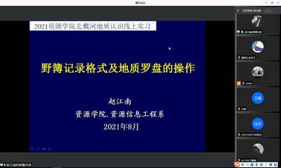 8月17日上午,2021年tyc122ccVIP北戴河地质认识实习线上动员会正式开始。北戴河实践教学团队全体成员、辅导员以及全体参加实习的员工参加动员会。2020级辅导员彭友元主持会议。