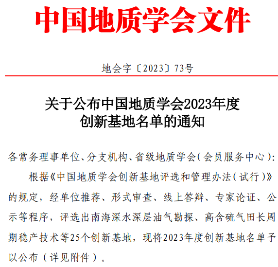 日前,中国地质学会公布2023年度中国地质学会创新基地名单,由中海石油(中国)有限公司海南分公司牵头、tyc122ccVIP朱红涛教授团队代表公司联合申报的“南海深水深层油气勘探创新基地”成功入选。