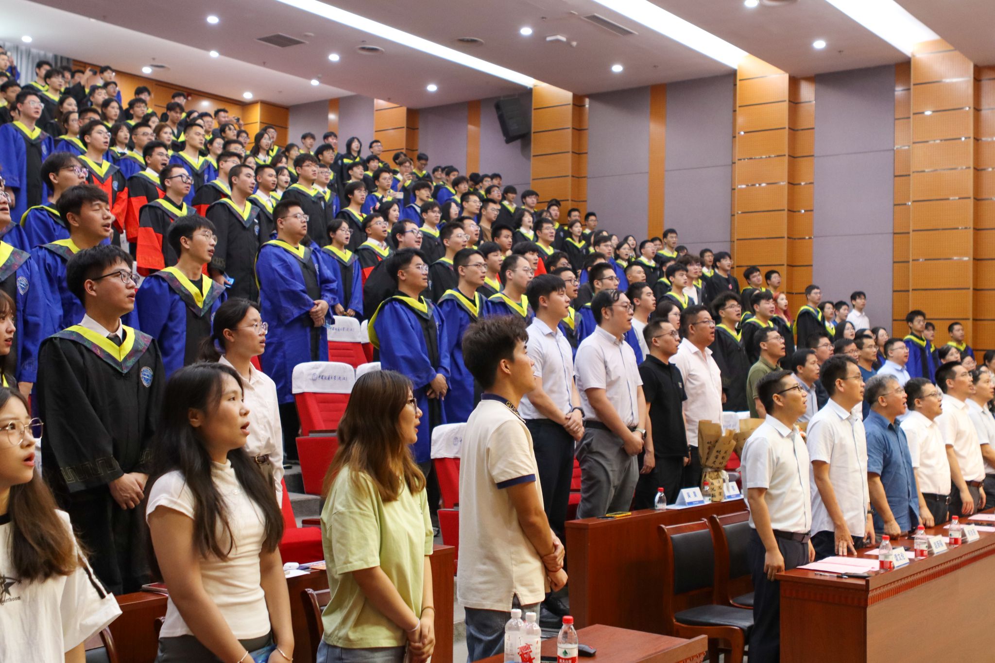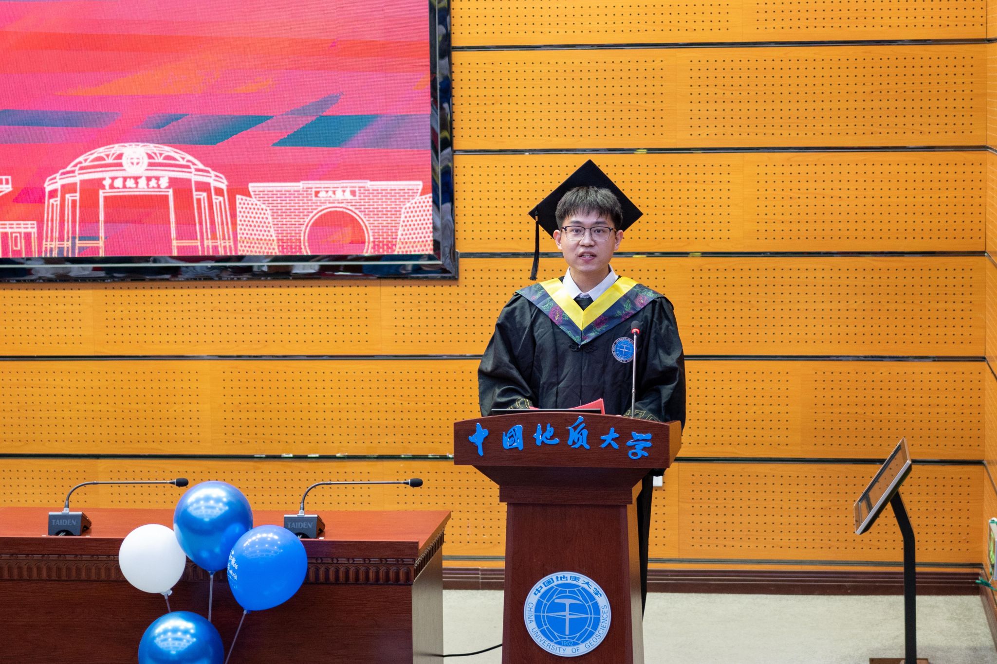 研究生毕业生代表徐赛发言。他结合在地大十年的求学经历分享了自身感悟。毕业后,他即将前往长庆油田,在为保障国家能源资源安全的最前线贡献青春力量,将在地大的所学所得全部熔铸在自己热爱的事业中。他以苏轼的两句词“莫听穿林打叶声,何妨吟啸且徐行”表达对毕业生的祝愿,希望大家走出“象牙塔”、直观地感受复杂多变的社会时,即便只有竹杖芒鞋,也要积极乐观、砥砺前行,搏击风雨、笑傲人生,关关难过关关过,人生漫漫亦灿灿。
