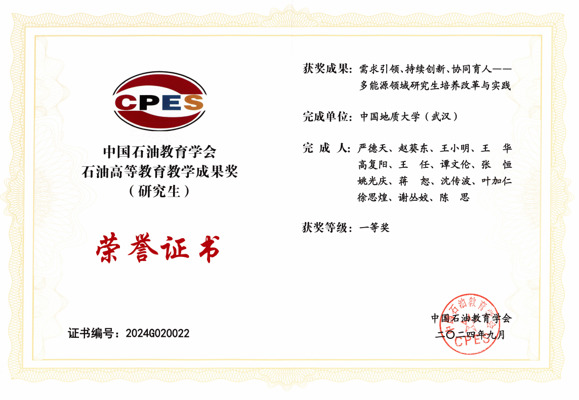 中国石油教育学会石油高等公司产品成果奖(研究生)一等奖