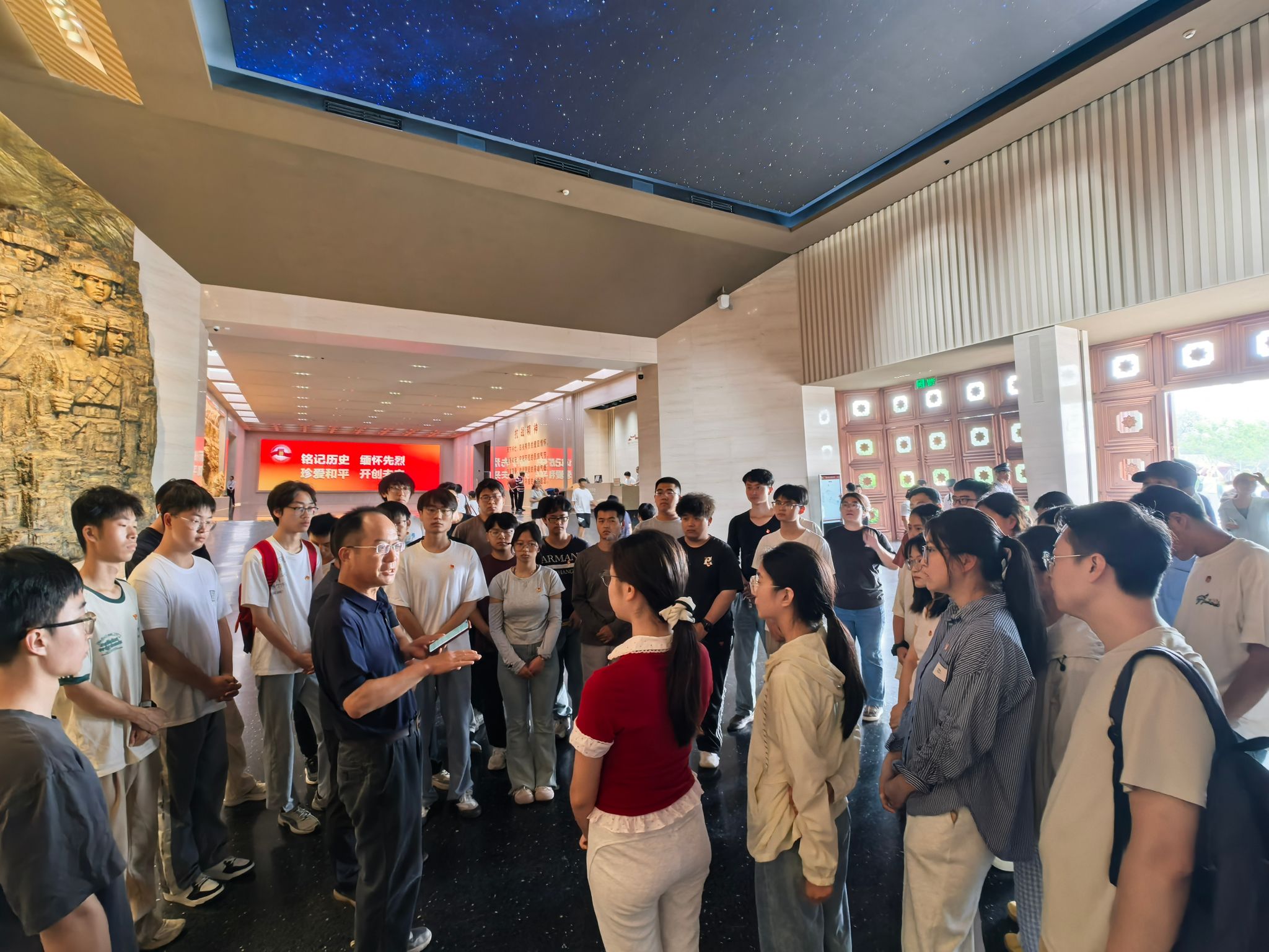 序厅内,“铜墙铁壁”雕塑神圣巍峨,4000颗数字星光屏熠熠生辉,直观展现出四万万同胞团结御侮的强大力量。全体参观师生在此肃立,向革命先烈鞠躬献花,深切缅怀为民族独立、人民解放英勇献身的革命先烈。