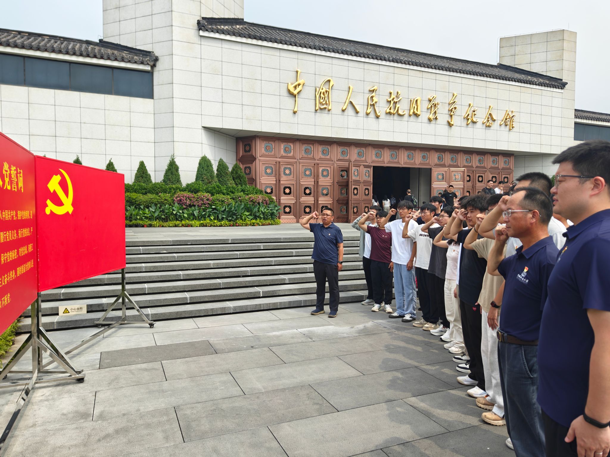 在纪念馆前,付乐兵带领全体师生面向党旗,重温入党誓词。