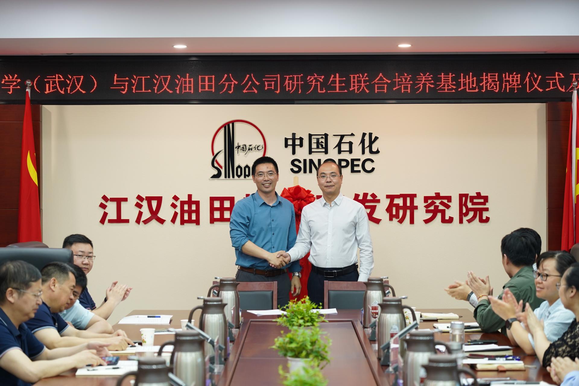 严德天和包汉勇代表双方签署培养协议并授牌。包汉勇代表江汉油田分公司对地大老师们实地访问表示欢迎,对公司多年来为油田发展给予的支持表示感谢。他表示,此次签约为校企合作搭建了新平台、迈上了新台阶,双方将以研究生联合培养为契机,深入开展科研攻关,加强技术交流,更好地推进产学研深度融合,实现校企全面深入合作。